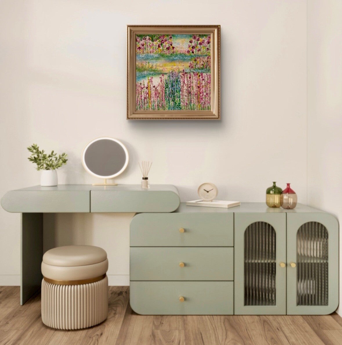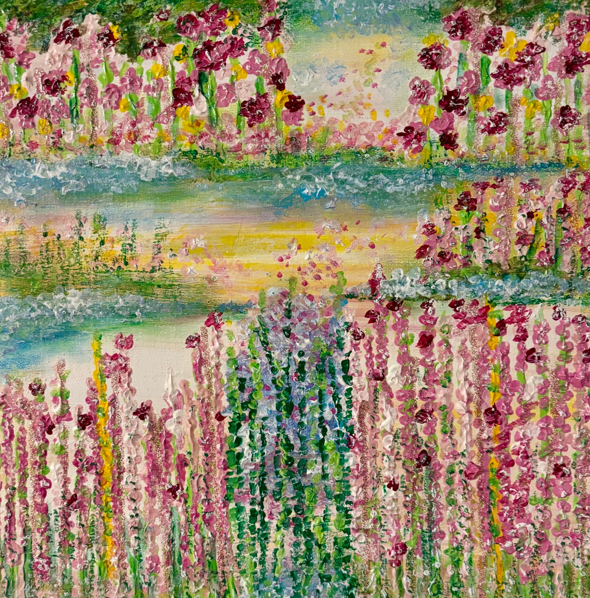 My Little Ray of Sunshine is a celebration of light, joy, and the fulfillment of long-held dreams. This floral abstract landscape by the lake reflects a deeply personal moment: as a teenager visiting Ft. Lauderdale, I stood on the sand, gazed out at the ocean, and whispered, “I want to live here.” Decades later, that quiet wish became reality, and this piece embodies that journey of hope, patience, and answered prayers.
