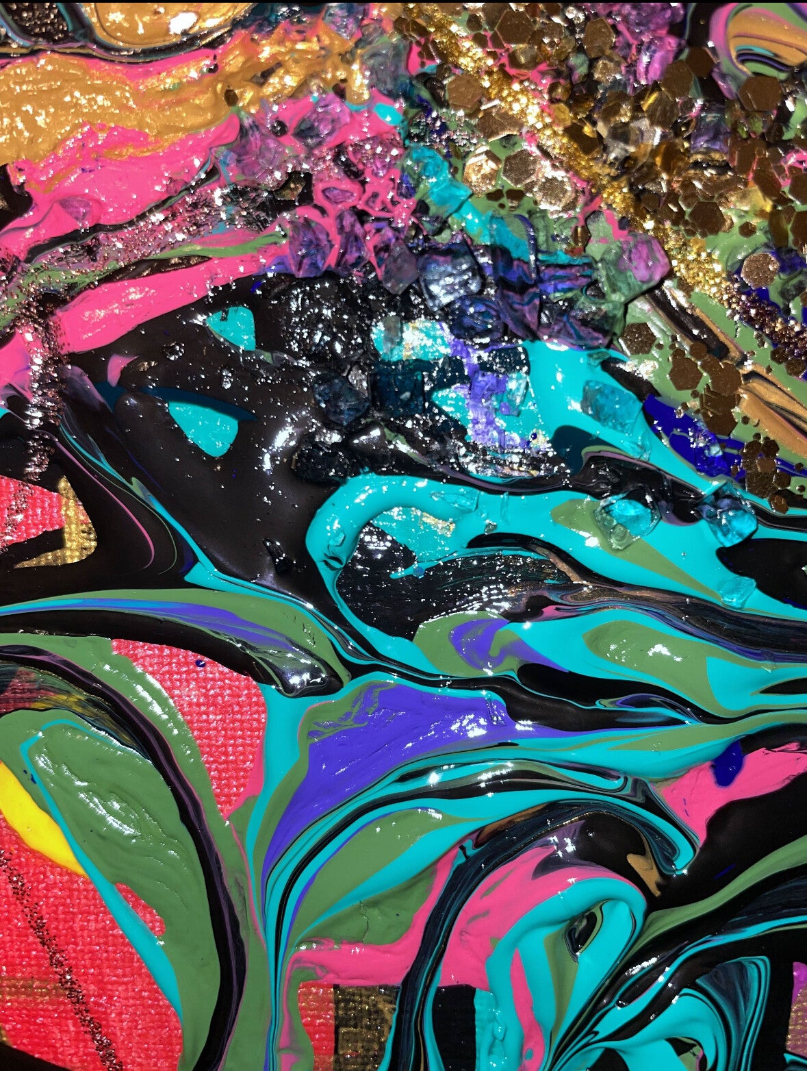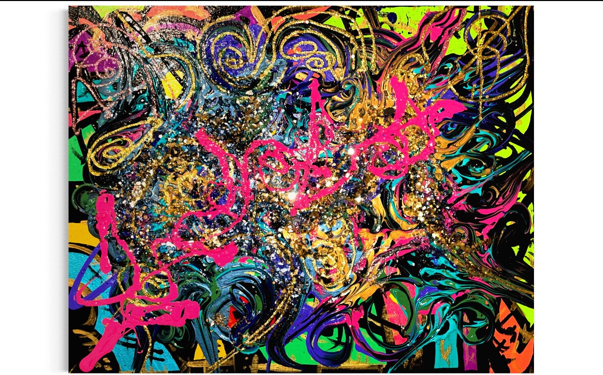 Love in Graffiti is a vibrant abstract mixed-media painting that captures the exuberance and individuality of the 1980s and 1990s in Northwest London. Crafted with acrylic paint, beads, and sequins, the work features the word “love” stretching diagonally across the canvas in striking pink, emerging from the chaos of color and texture. The piece is a nostalgic homage to the era when graffiti and rap culture were gaining recognition, and life was an explosion of creativity, personality, and self-expression-seen in the bold fashion, colorful buildings, and fearless individuality of the time.