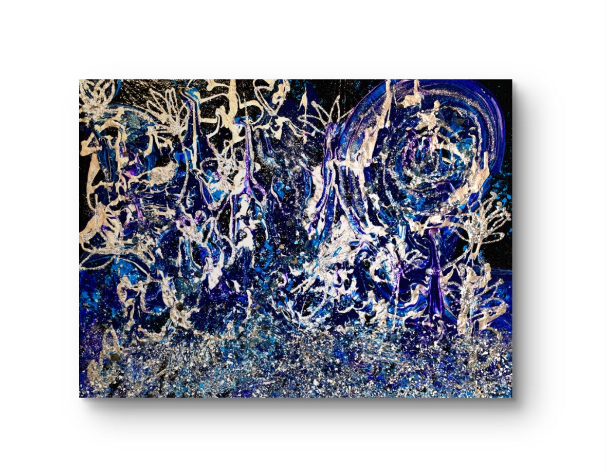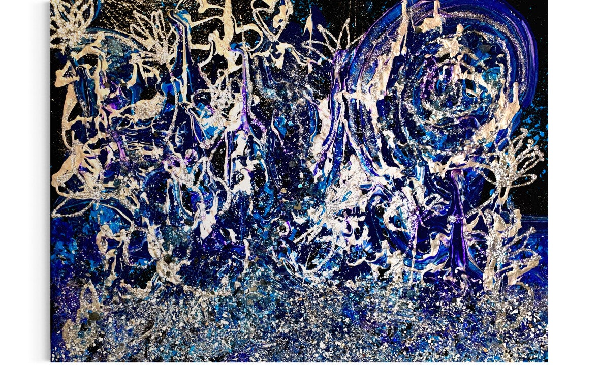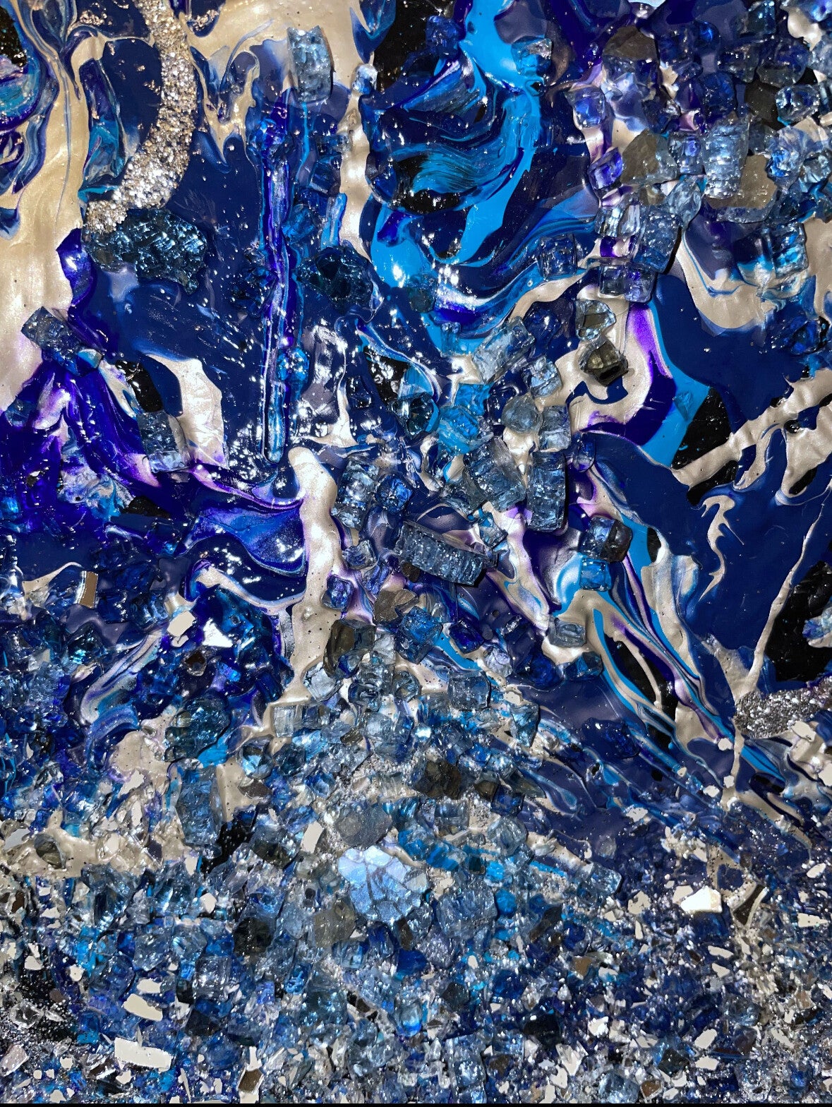 The Love You Give is an abstract mixed-media painting inspired by the ocean at night. Rendered in shades of blue and white, and accented with clear and blue crystals, the piece evokes the movement and shimmer of waves under moonlight. The flowing textures and reflective surfaces create a sense of depth and motion, mirroring the ebb and flow of life and emotion. This work is a visual metaphor for love-the energy we give to the world, which returns to us, often multiplied. The painting encourages reflection on the power of generosity, kindness, and compassion in our lives.