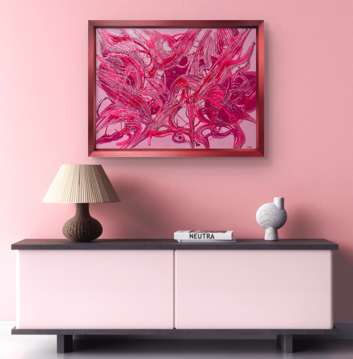 She’s Pretty in Pink is a celebration of femininity, resilience, and the many dimensions of womanhood. It captures the duality of pink-soft yet strong, tender yet powerful-highlighting the courage, endurance, and beauty in a woman’s journey. This piece is a tribute to love, survival, and the strength found in vulnerability, inviting viewers to reflect on the profound power of color, emotion, and lived experience.