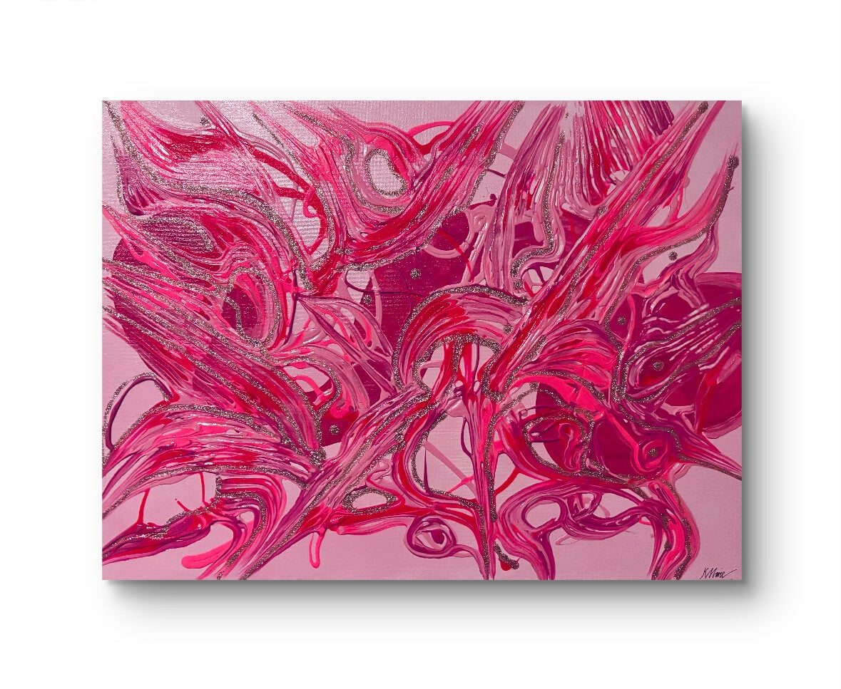 She’s Pretty in Pink is an abstract acrylic painting that explores the depth, complexity, and power of the color pink. While traditionally associated with femininity, the piece also evokes themes of romantic love, tenderness, resilience, and survival. The combination of red and white hints at the blood, tears, sweat, and roles that shape a woman’s life. Through its layered textures and shades, the painting reflects both softness and strength, showing that vulnerability and power can coexist beautifully.