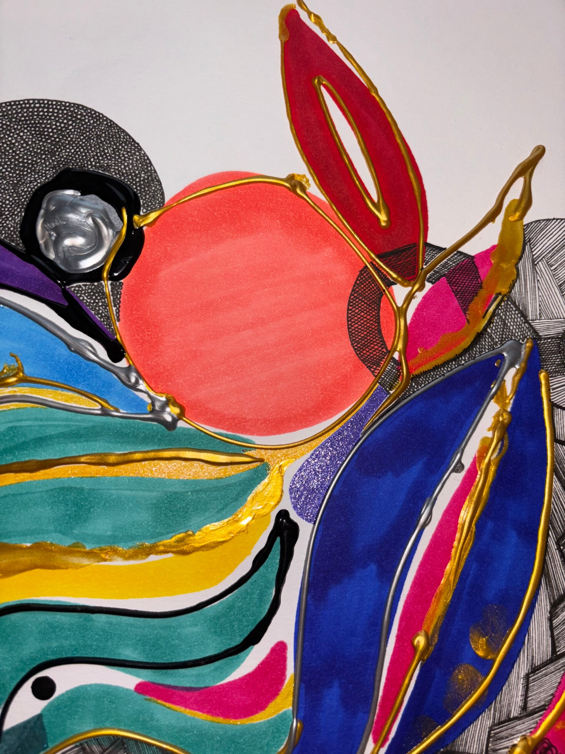 This abstract, colorful drawing is inspired by the radiant presence of the sun. One of the things I love is traveling, but when I return home, I feel embraced by the way the sun seems to welcome me back, as if it knew I had been away. What I love about Florida is the sun’s constant presence-it shines nearly 70% of the time, all year round, regardless of the weather. The sun illuminates and beautifies everything around it, casting warmth on the environment and the people within it. To me, the sun is a symbol of hope, joy, and energy, a reminder that everything will work out in the end. Its light brings happiness, vitality, and a sense of renewal to life.